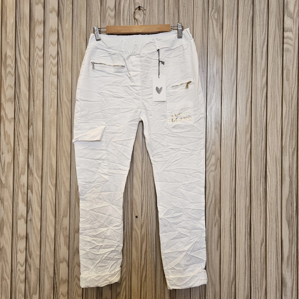 Estos pantalones italianos destacan por su diseño moderno con cierres funcionales y la frase Amore Milano estampada en letras doradas ✨. Son elastizados, cómodos y perfectos para armar un look con estilo propio. Ideal para quienes buscan una prenda urbana, audaz y versátil 🙌.